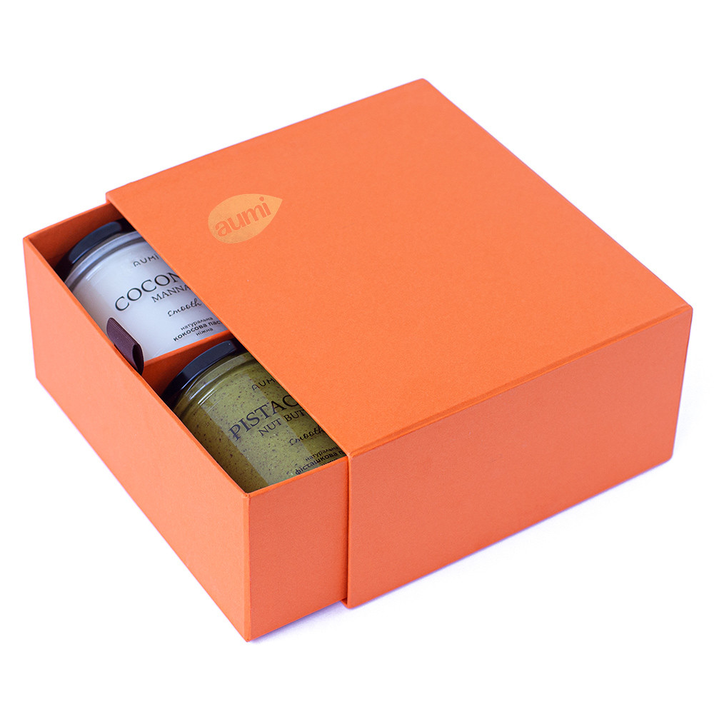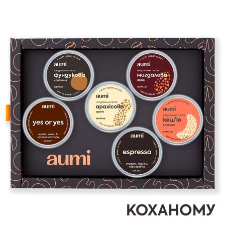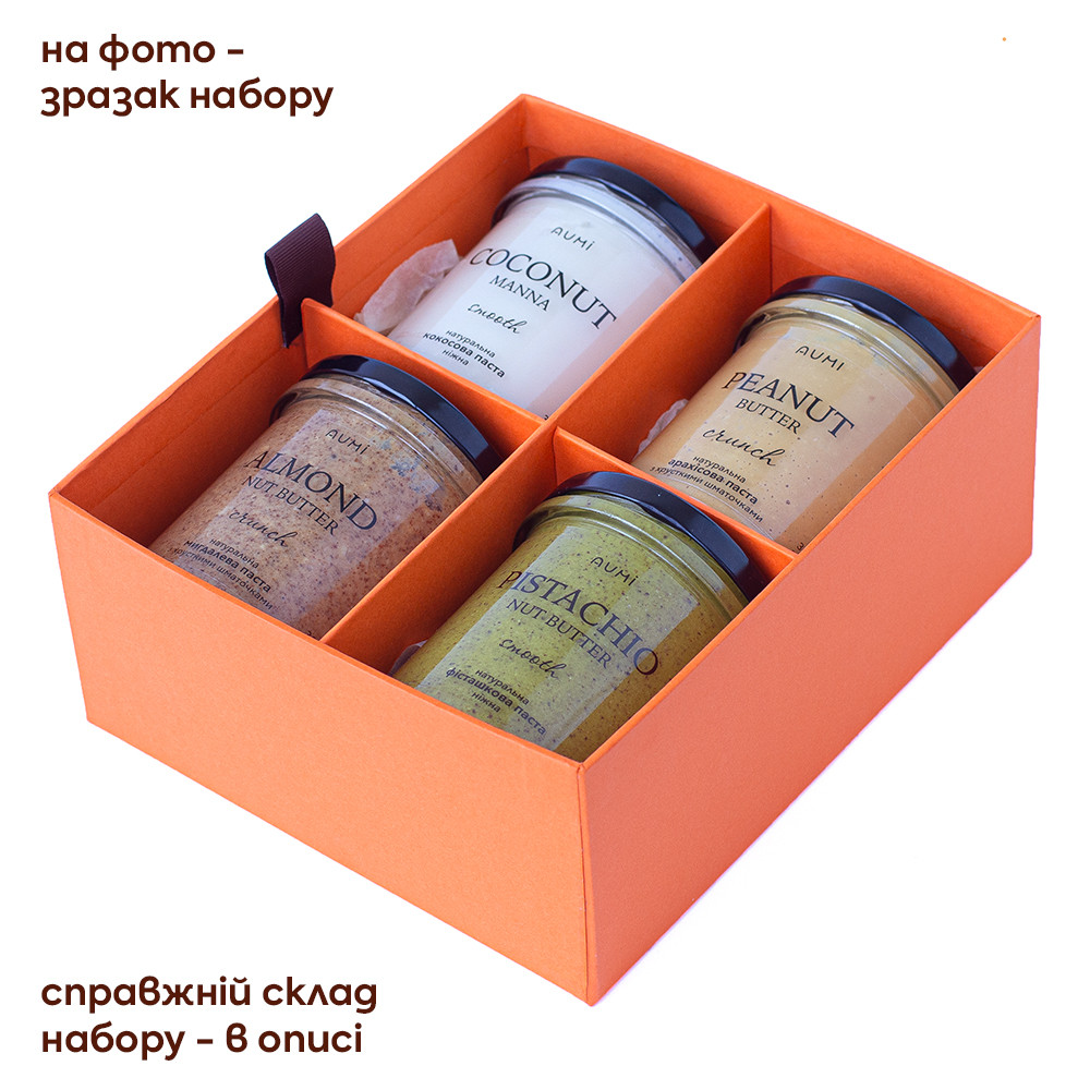Подарунковий набір AUMi ТОПОВИЙ. Чотири горіхові пасти в скляних банках по 300г у VIP коробці.
