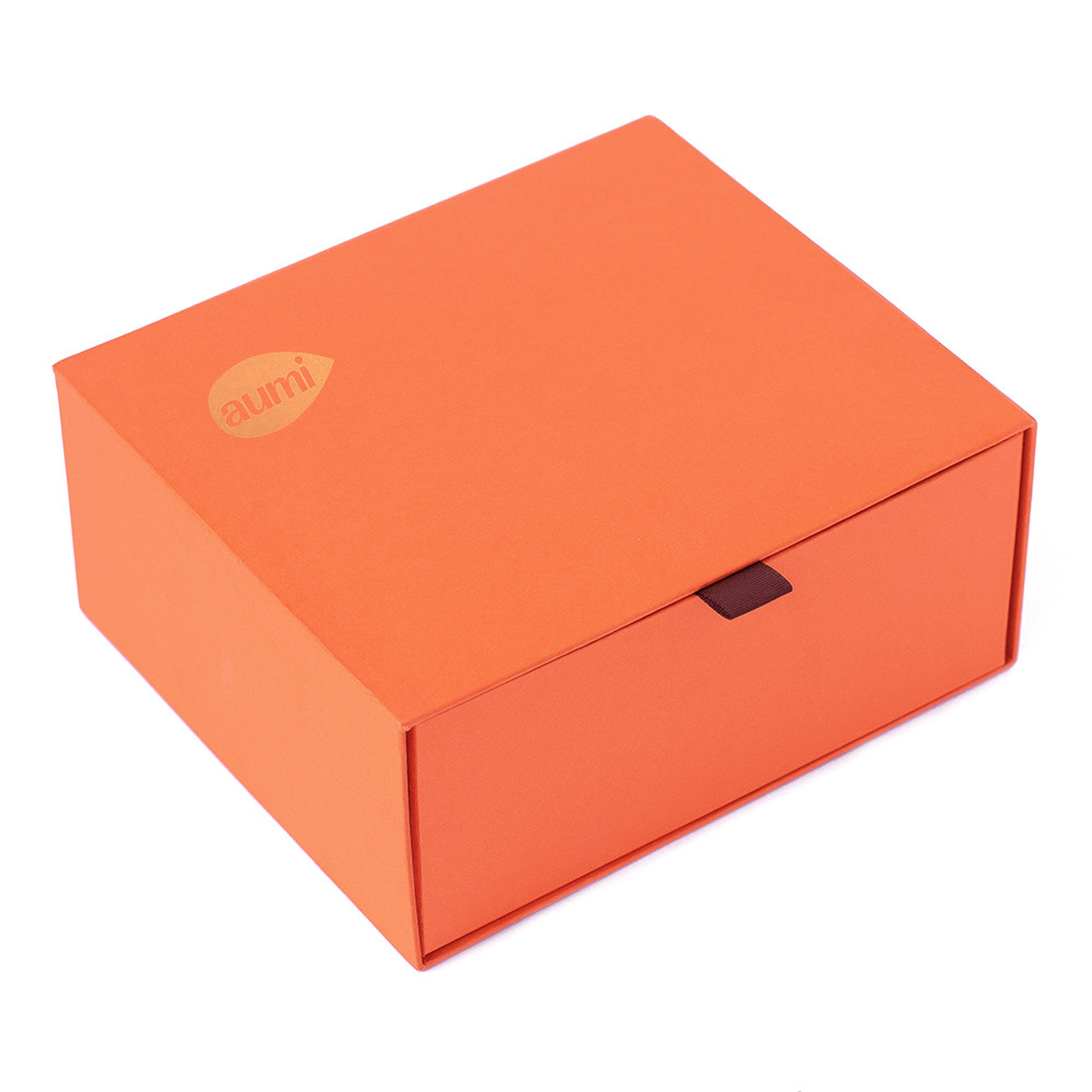 VIP коробка зроблена з якісного і міцного палітурного картону. Виконана в корпоративному помаранчевому кольорі. Внутрішня частина висувається з-під кришки по аналогії з коробкою цукерок за стильний тканинний язичок. Вона також фіксується всередині обичайкою двох кольорів на вибір – шоколадною і кольору слонової кістки. Лого та слоган надруковані стильною металізованої фарбою. Зручний ложемент фіксує і розділяє банки всередині (для набору 4х банок по 300г).