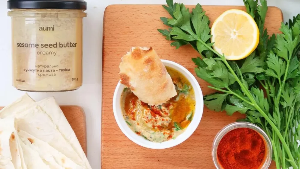 Дай баклажанам трохи охолонути, а потім ложкою вибери м’якоть баклажанів в окрему миску. Додай часник, сіль, перець, тахіні та паприку. Видави в миску з баклажанами сік половини лимона.