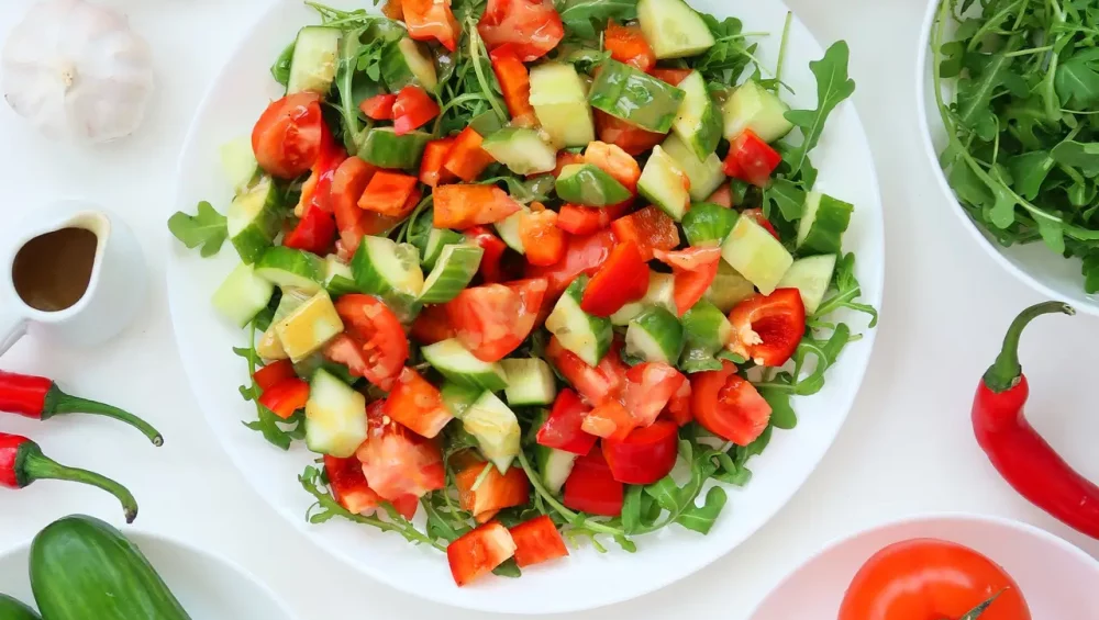 Викласти на тарілку руколу, зверху викласти овочі та полити соусом.