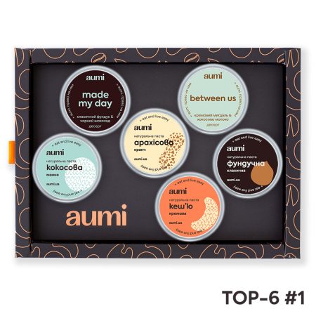 На сайте представлены различные варианты наборов ореховых паст AUMI по 6 и 4 шт в такой подарочной коробке. Их можно найти в разделе Подарочные наборы.