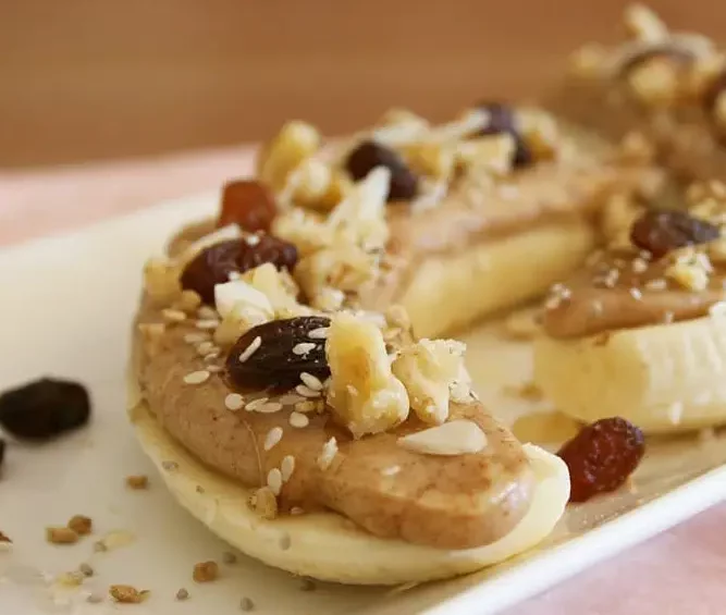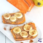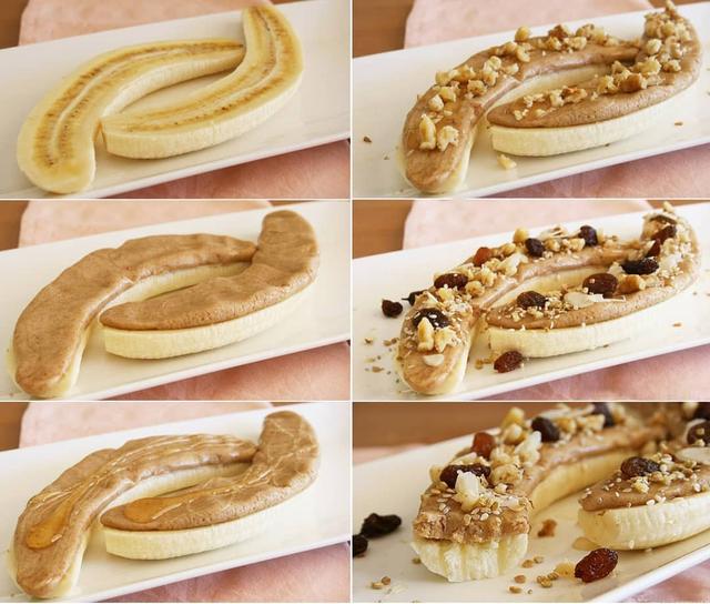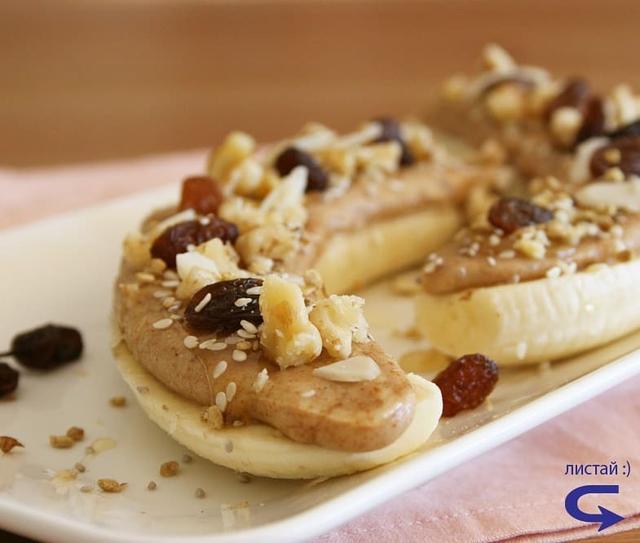 Мы заменили арахисовую пасту миндальной, потому что очень ее любим 🙂 Вместо хлеба взяли банан. Получилась простая легкая утренняя закуска, достаточная для того, чтобы наполнить воскресное утро энергией для пробежки, спорта или похода на море.